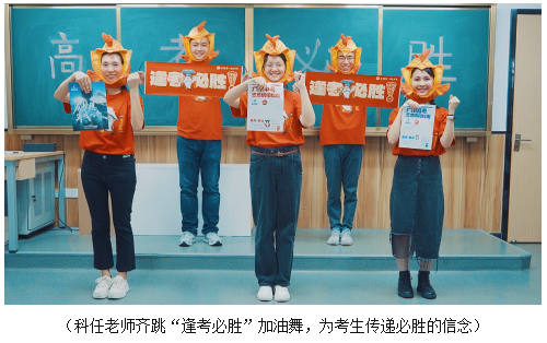 “平常我们上课会比较严肃,这次老师们就想用年轻人喜欢的方式为同学们花式打Call。如果能一边吃必胜客一边看老师跳加油舞,孩子们肯定会很惊喜。”杜老师把这一想法与其他科任老师们分享,大家都觉得很棒。在课余休息时,老师们积极学习舞步,练习表情,用饱满的精神录制加油舞视频。“毕业礼”当天,同学们看着科任老师们身穿红色“逢考必胜”服、头戴“锦鲤”,手拿填报志愿指南,欢快的舞步演绎的逗趣视频,爆发阵阵欢声笑语;校长变身“必胜使者”,送上热腾腾的比萨,让学生们直呼暖心。现场热闹的气氛瞬间拉满,老师们的真挚祝福点燃了必胜的力量。